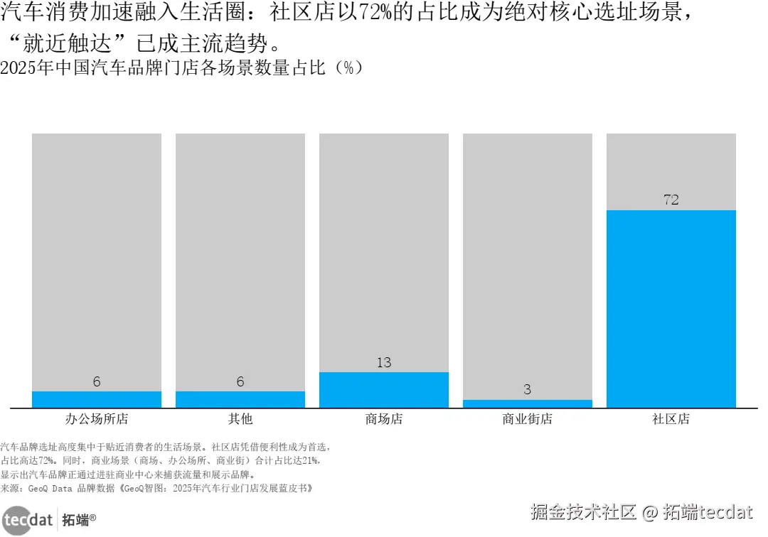 汽车消费加速融入生活圈:社区店以72%的占比成为绝对核心选址场景,“就近触达”已成主流趋势。