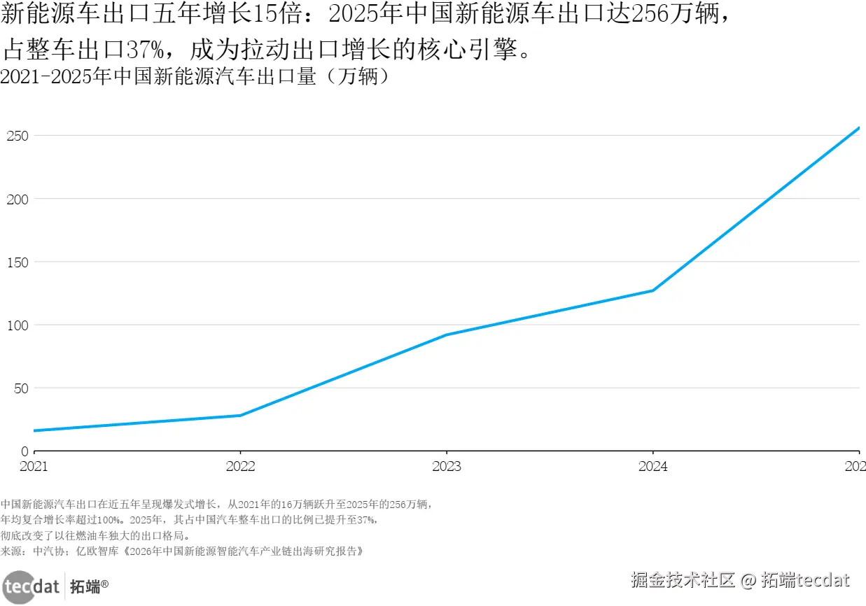 新能源车出口五年增长15倍:2025年中国新能源车出口达256万辆,占整车出口37%,成为拉动出口增长的核心引擎。