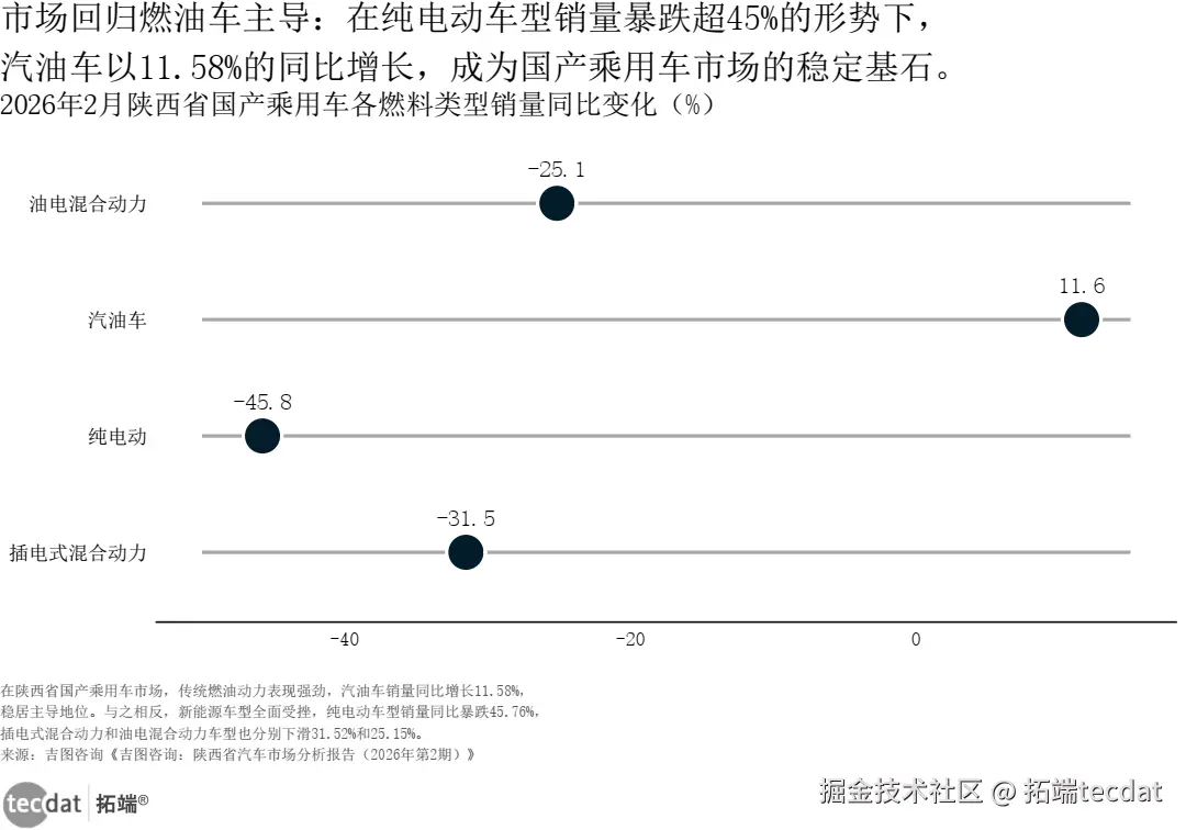 3秒解读:政策用“真金白银”引导消费者抛弃燃油车,但奇怪的是——陕西省2026年2月数据显示,燃油车销量同比+11.58%,纯电反而暴跌45.76% 。为什么?因为补贴政策有“滞后效应”:消费者需要时间理解规则,而经销商在清燃油库存。