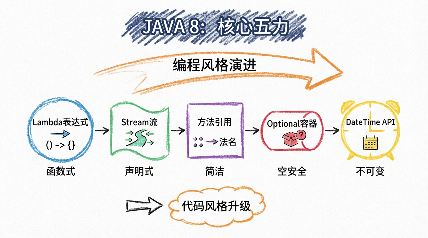 这一篇不追求大而全,只讲最该掌握的 5 个核心能力:Lambda、Stream、方法引用、Optional 和 DateTime API。把这几个点吃透,你的 Java 代码风格会明显上一个台阶。