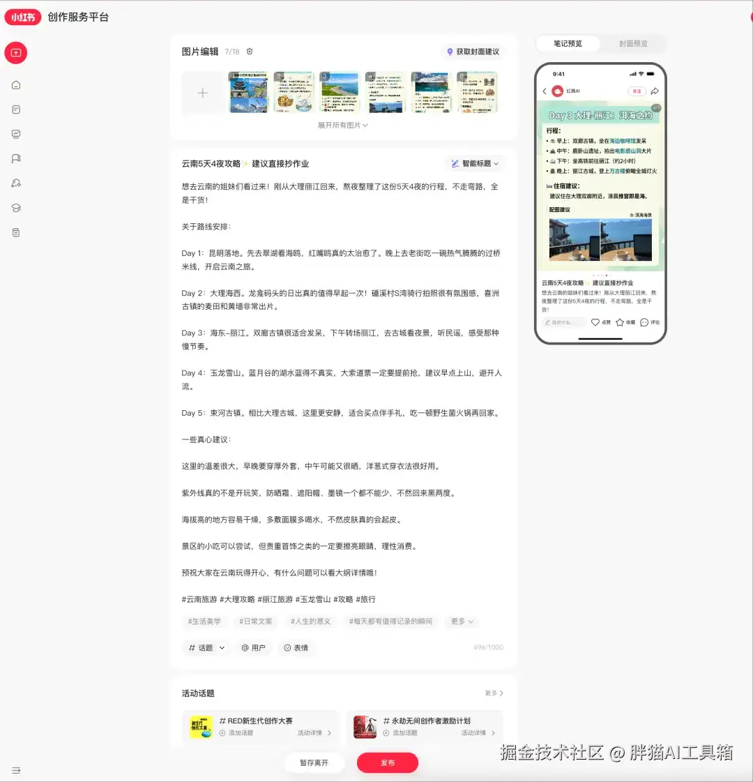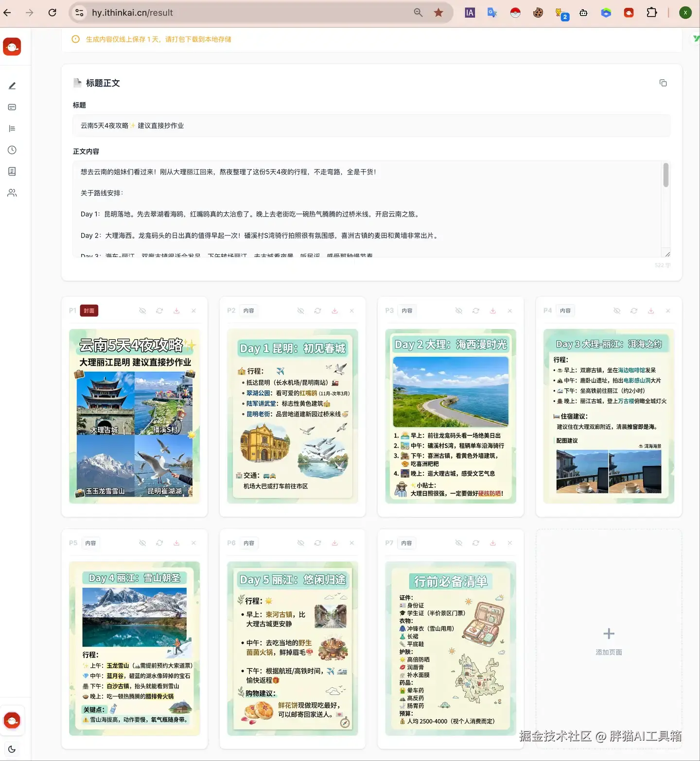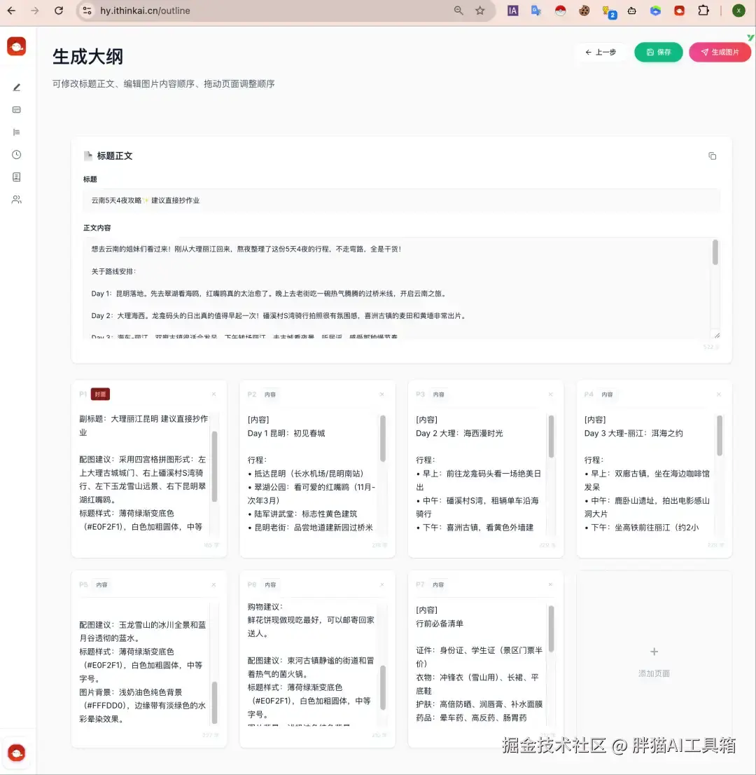 第二步:生成对应的标题、正文以及每一张图的图片描述。它会自动帮你把内容的节奏感规划好,每一张图要配什么文字,都写得清清楚楚。