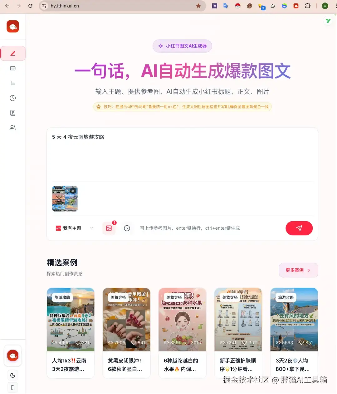 它解决了 AI 创作中最致命的问题:风格漂移。很多工具今天做个复古风,明天变二次元,根本没法做 IP。红鸦 AI 生成的图片背景、字体、色调高度一致,文案更有“人感”,哪怕是金融、旅游这种专业性极强的领域,也能稳稳接住。