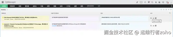 告警触发后可直接关联自定义工作流(如自动执行磁盘清理脚本、端口流量分流策略)或生成标准化工单并分配至对应运维团队,实现从风险预测、智能建议到自动化处置的全流程闭环。