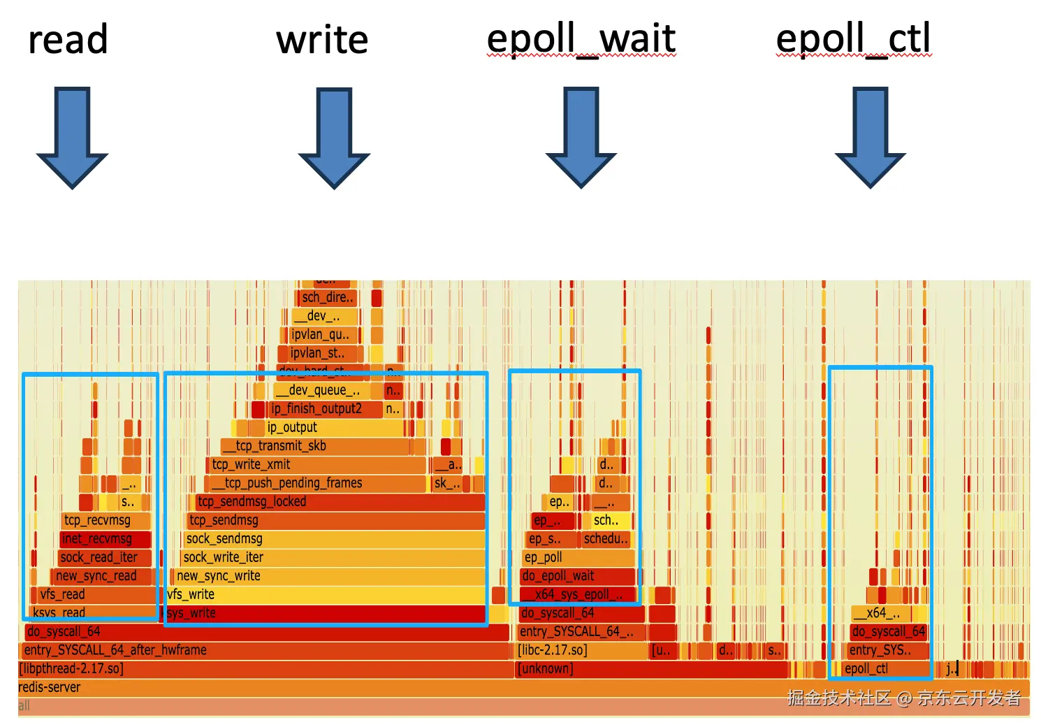 通过火焰图我们可以看出,单线程的JIMDB只有少部分CPU在处理命令,大多数CPU时间花费在网络IO上。
