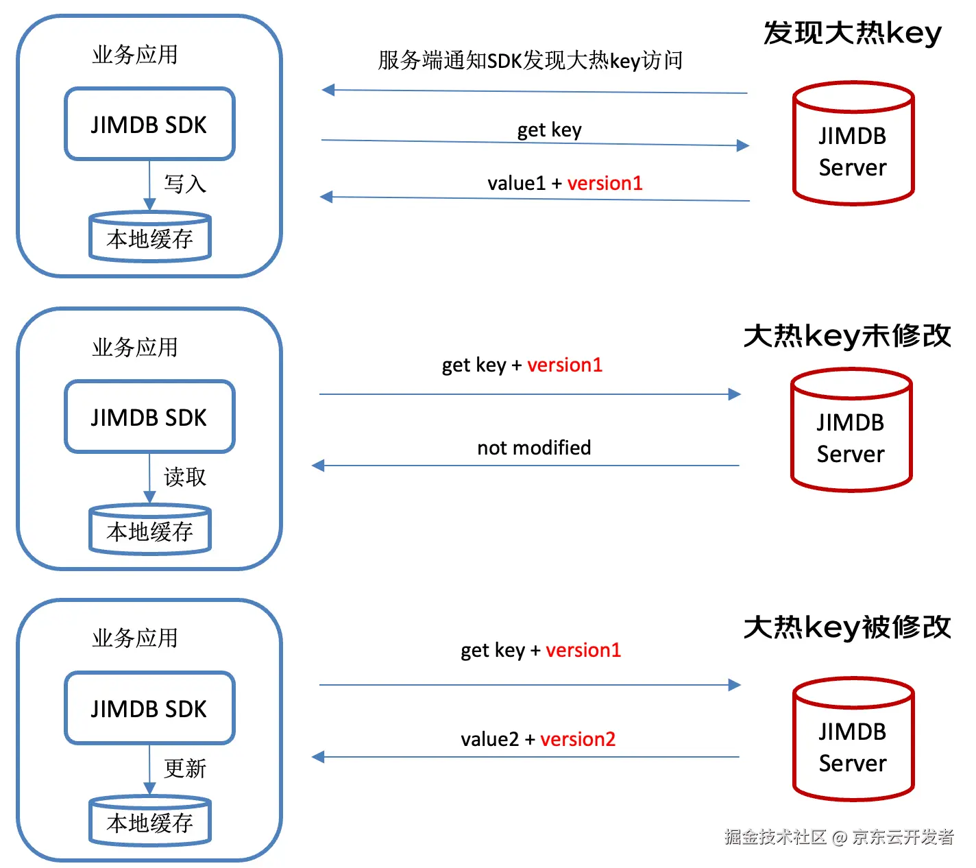 客户端缓存解决了大热key访问带宽瓶颈问题,并且可以保障保障客户端缓存与服务端数据的一致性。每个大热key缓存项都带有一个版本号。一旦该key被修改,JIMDB会同步修改缓存项的value和version。
