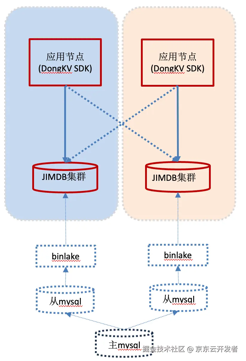 互备模式下的数据同步通常由业务自身的数据流驱动。以一个典型的商品读服务为例,其写数据链路(图中虚线框部分):应用将数据写入数据库,然后通过Binlake(数据同步中间件)将其“刷入”同机房的JIMDB集群。这样,每个机房都形成了一个写链路垂直封闭的单元,数据通过数据库的底层同步在机房之间实现最终一致。此写链路因业务而异,属于业务架构的一部分,不包含在DongKV中间件内。DongKV在此模式下的核心价值,是提供对双集群的智能路由与故障切换能力。