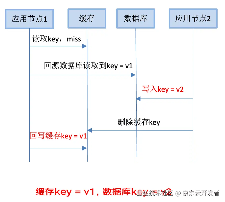 下面的示意图解释了这种不一致发生的原因。应用节点1访问缓存的key,没有读到数据,回源到数据库读取到key = v1。在回写缓存之前,应用节点1的工作线程被挂起。随后另一个应用节点2正好把数据库改成key=v2,然后删除缓存里的脏数据(虽然这时缓存还没有该key的数据)。之后应用节点1恢复执行,把key=1回写到缓存。这时候缓存的key=v1,数据库的key=v2,从而造成数据不一致。