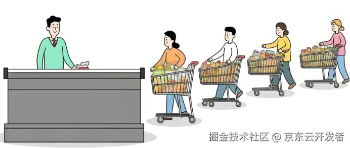 这里以超市收银员的工作来做个类比。现在我们网上购物比较多,很久以前我经常会去一家超市线下购物。这个超市只有一个收银员,需要做商品扫码、计算总额、把商品打包到购物袋的事情。这个收银员非常熟练,即便在排队的高峰期,我们也能在几分钟内完成结账。有一天我排了10分钟,发现队伍没怎么动。上前看了眼,每个人购物车里都是满满的商品,据说是活动打折。收银员忙的不亦乐乎,估计最少还得等半小时,我只好放下东西走了,默默走了。