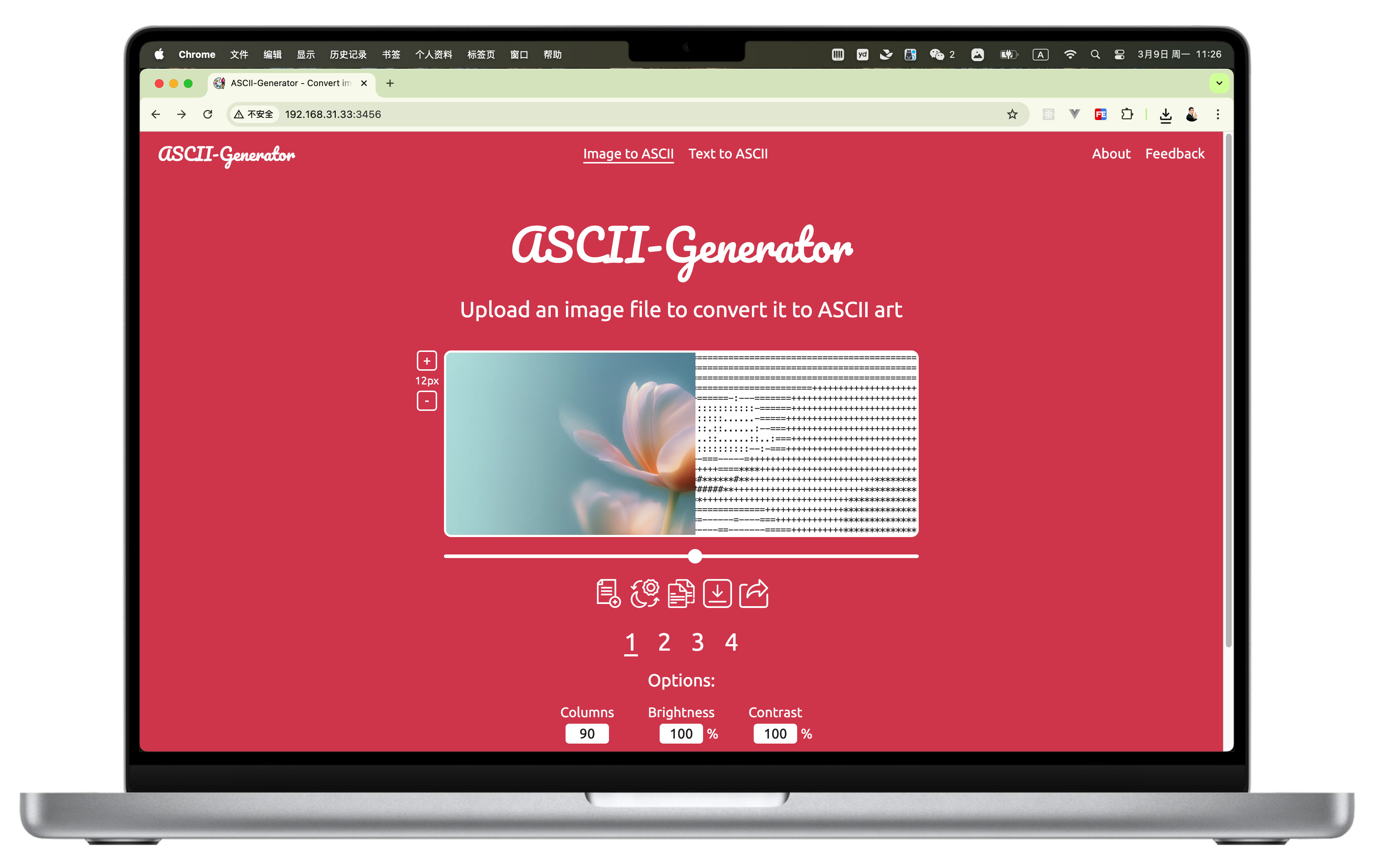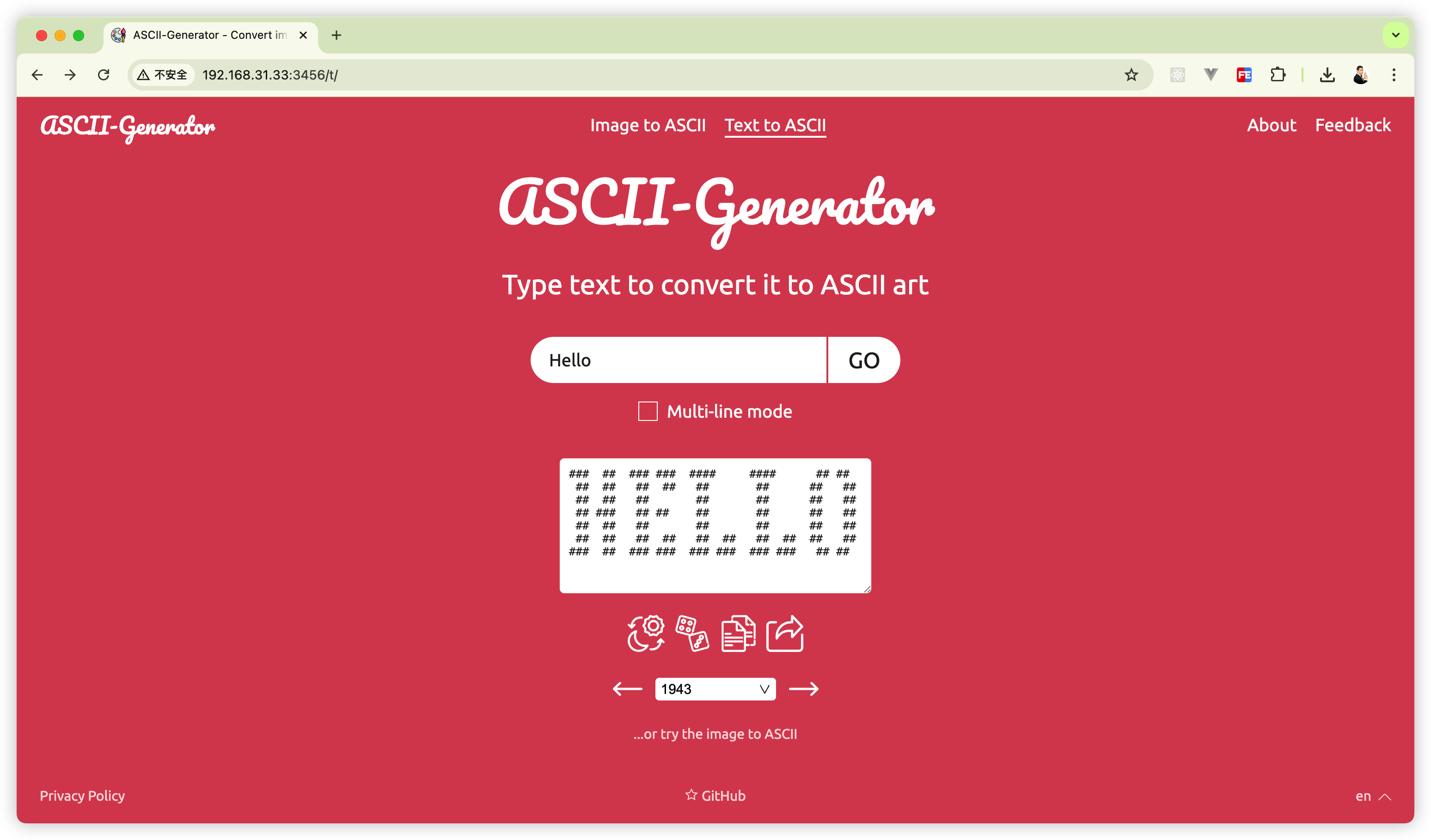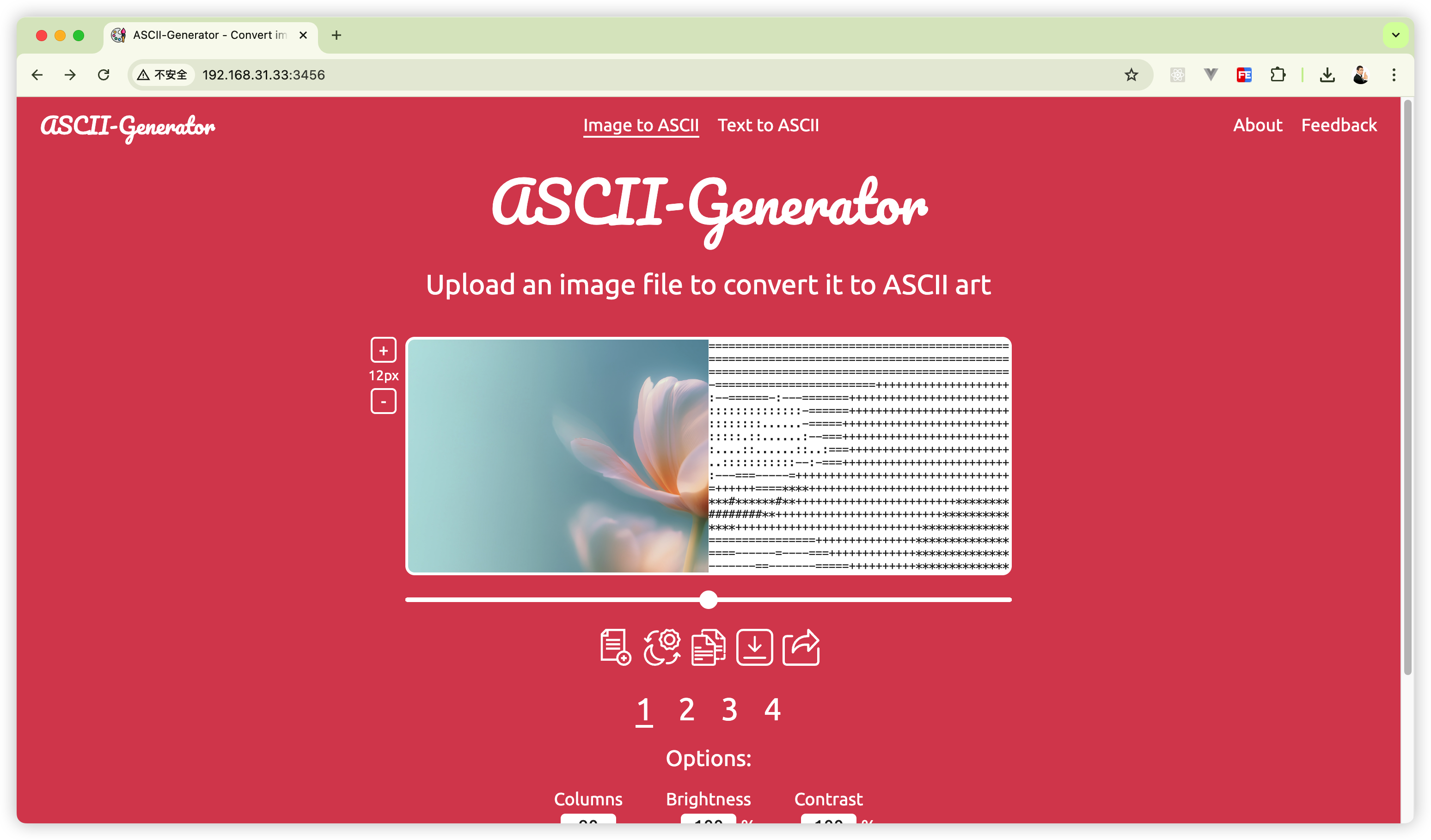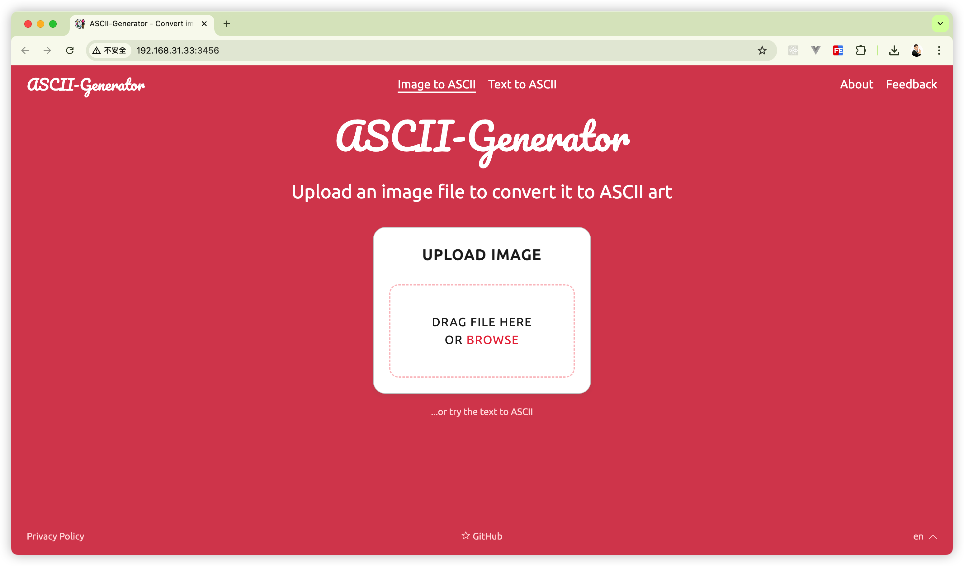 等项目构建成功后,打开浏览器输入 NAS_IP:3456 就可以使用 ASCII-Generator 了。