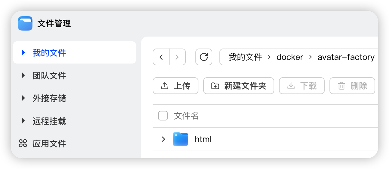 打开飞牛的「文件管理」应用,找到 docker 文件夹,在里面创建一个 avatar-factory 文件夹。