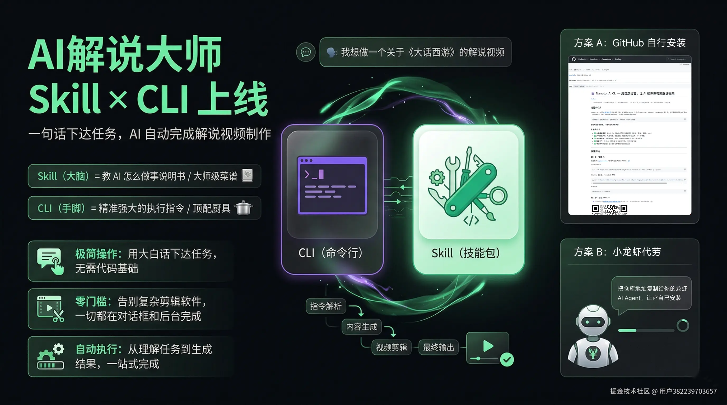AI解说大师的自动化视频生产分两个部分:CLI 是"手" ,把选素材、选模板、生成视频这些操作封装成了一条条终端命令;Skill 是"脑" ,是一份技能说明书,让 AI 助手(小龙虾 OpenClaw、WorkBuddy、Windsurf 等)读懂后知道怎么调用这些命令。