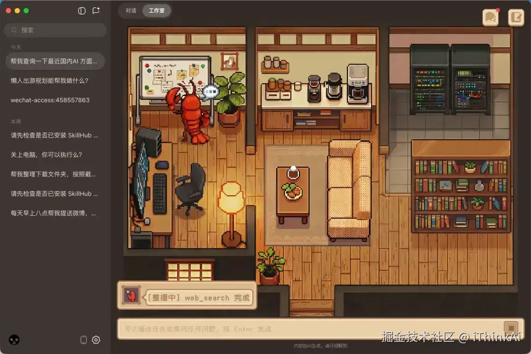 它把场景分得很细,有专门的工作间、茶歇间甚至图书馆,每个空间对应的 AI 逻辑都不一样。最实在的一点是,它每天免费提供的 Token 额度非常惊人,约 4000 万 Token 的吞吐量,基本告别了额度焦虑。
