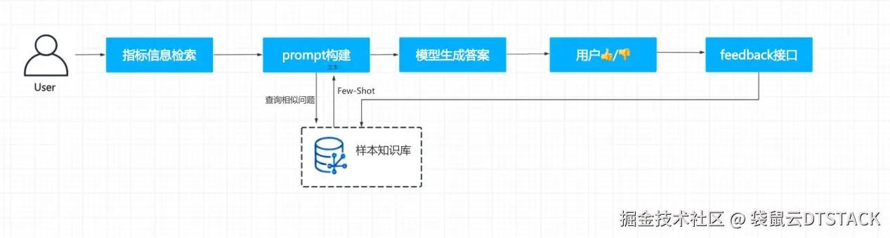 在实现上,这套机制并不复杂。系统先通过反馈接口收集用户的 query、answer 和 feedback_type,再把样本写入向量数据库;每次有新问题进来时,先检索相似历史问答,选出相关的 few-shot 示例,再把这些“好/坏例子”拼进 Prompt 中,去影响模型本次的回答逻辑。