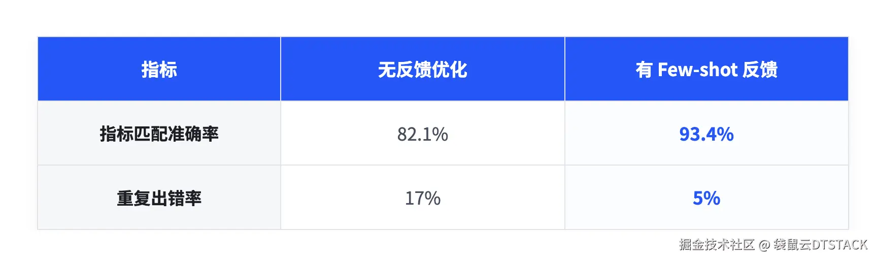 这套机制最有价值的地方在于,它不依赖重新训练模型,也不需要高成本微调。模型本体可以保持不动,知识通过 Prompt 实时注入,样本可以动态更新,效果却能够随着使用不断积累。对于企业场景来说,这种路径比传统微调更轻、更快,也更适合业务不断变化、指标不断调整、组织语言持续演进的现实环境。