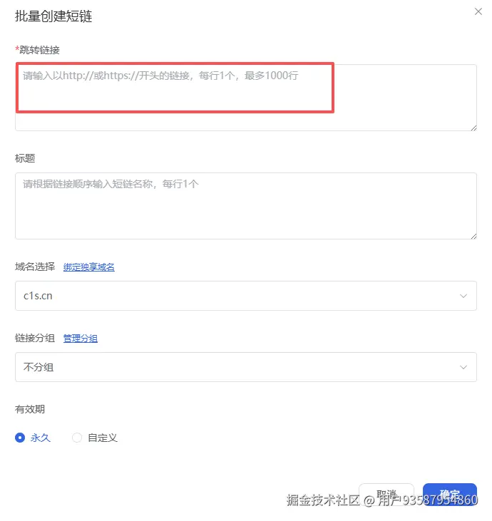 使用方法:进入C1N短链接(c1n.cn)控制台,点击批量创建,然后输入提前准备好的链接,每行一个,一次性可输入1000个,点击【确定】,一键就搞定了。可以省下太多时间了。
