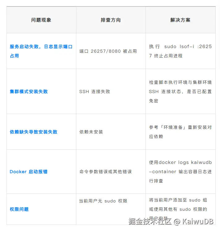 别担心,这篇文章为你准备了一份 KaiwuDB 社区版全场景安装指南。从环境准备,到三种模式(单机、集群、容器)的安装步骤,再到验证连接和常见问题排查,全都帮你梳理清楚了。无论你是快速体验尝鲜,还是为正式项目做准备,跟着这篇文章走,就能顺利跑通第一个 KaiwuDB 实例。