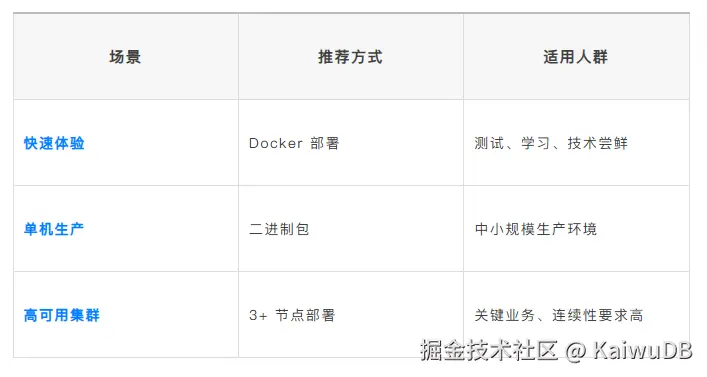 拿到一款新数据库,最让人头疼的往往不是功能够不够强,而是第一步"装起来"就遇到各种问题------环境怎么配?单机体验和生产部署有什么区别?Docker 怎么跑?