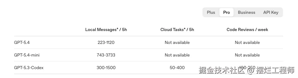 - GPT-5.4 的额度:223 ~ 1120 条