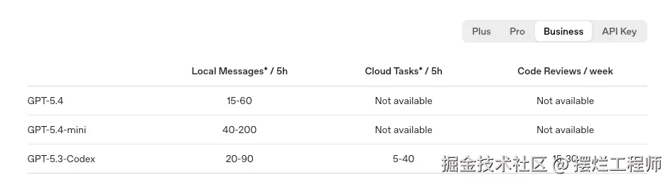 之前 Business 的 Codex 额度是和 Plus 差不多一致的,根据 OpenAI 官方 2026 年 4 月 2 日的数据来看看最新的 Codex 额度变化: