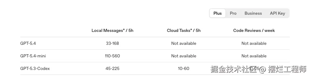 目前通过官方的文档公布,我们常用的 Codex CLI 的本地消息的5小时限额分别为: