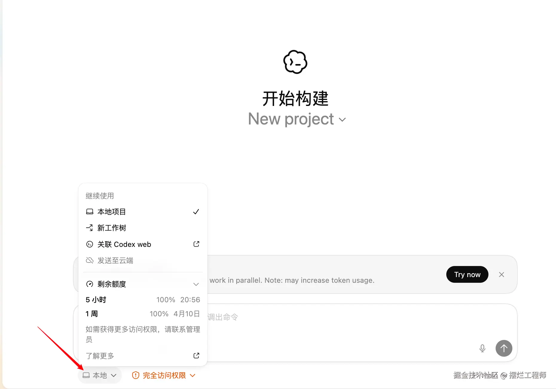 在 Codex App 上,同样在本地按钮的位置上。官方在推广 Codex 应用,如果你在 Codex 应用上使用 Codex,额度会进行翻倍。