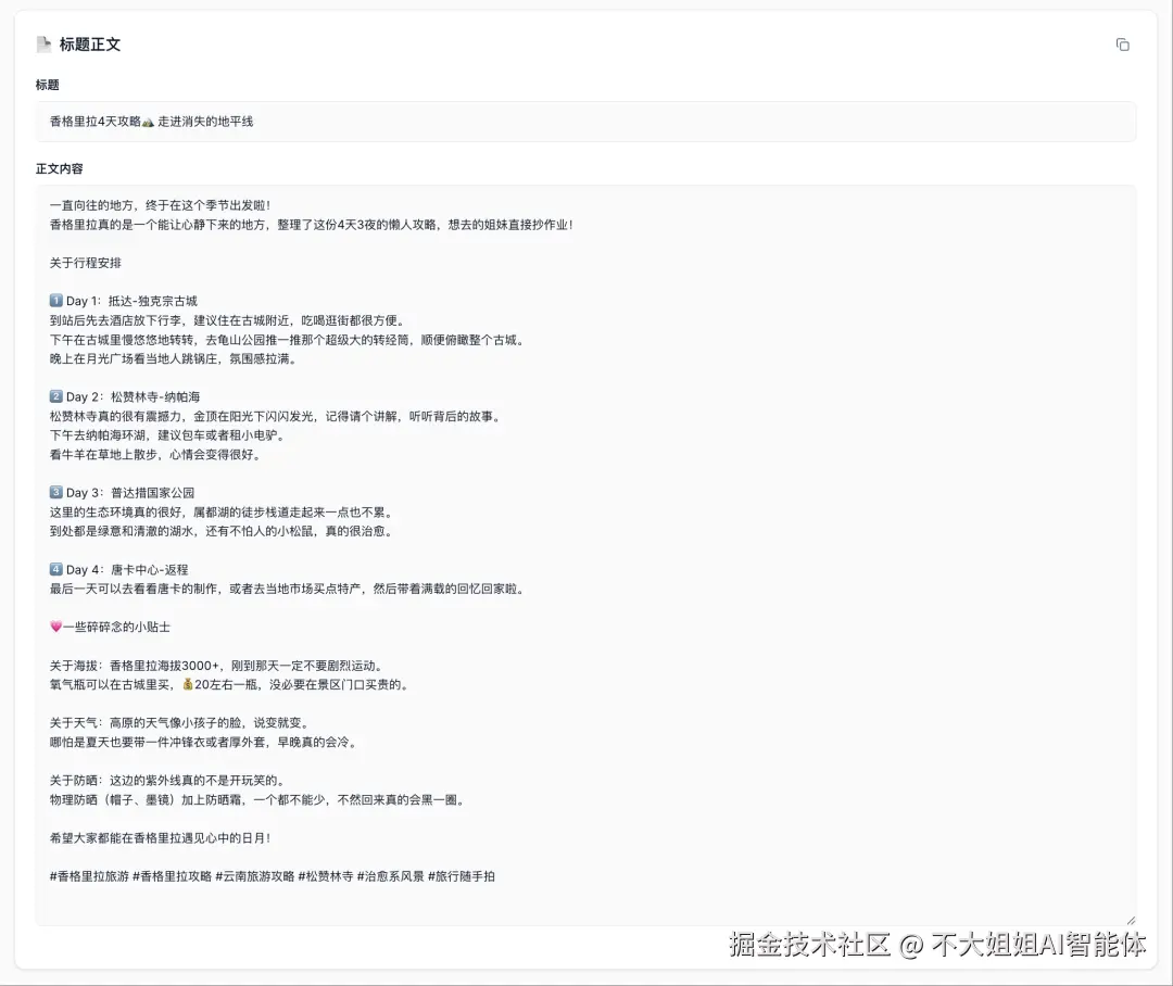 第二步:生成对应的标题、正文以及每一张图的图片描述。它会自动帮你规划好整套图文的排版建议,甚至是图片上的文字文案。