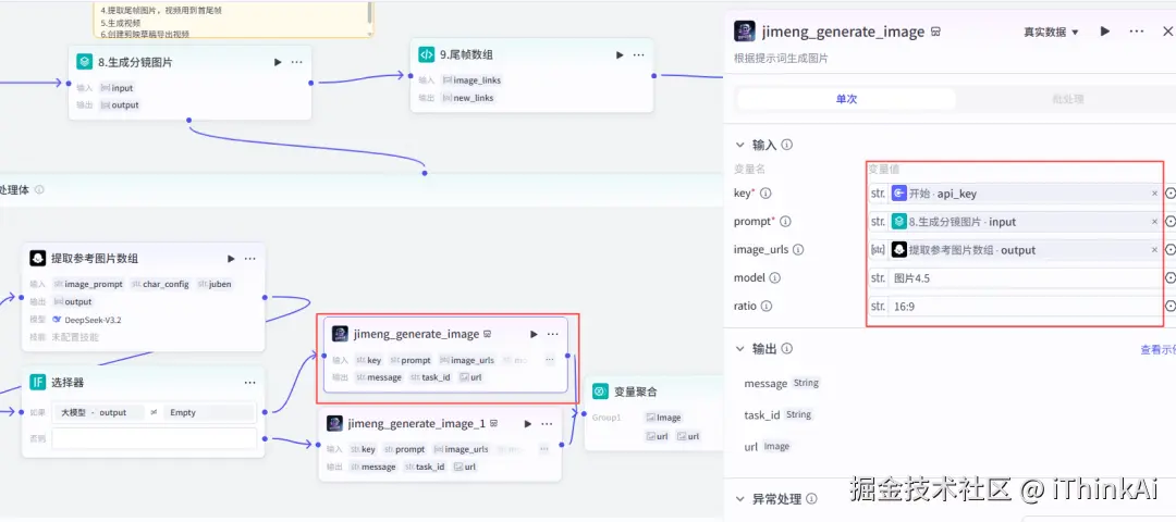 添加第三方插件米核的【即梦图片生成】的【jimeng_generate_image】,根据参考图片生成分镜图片。