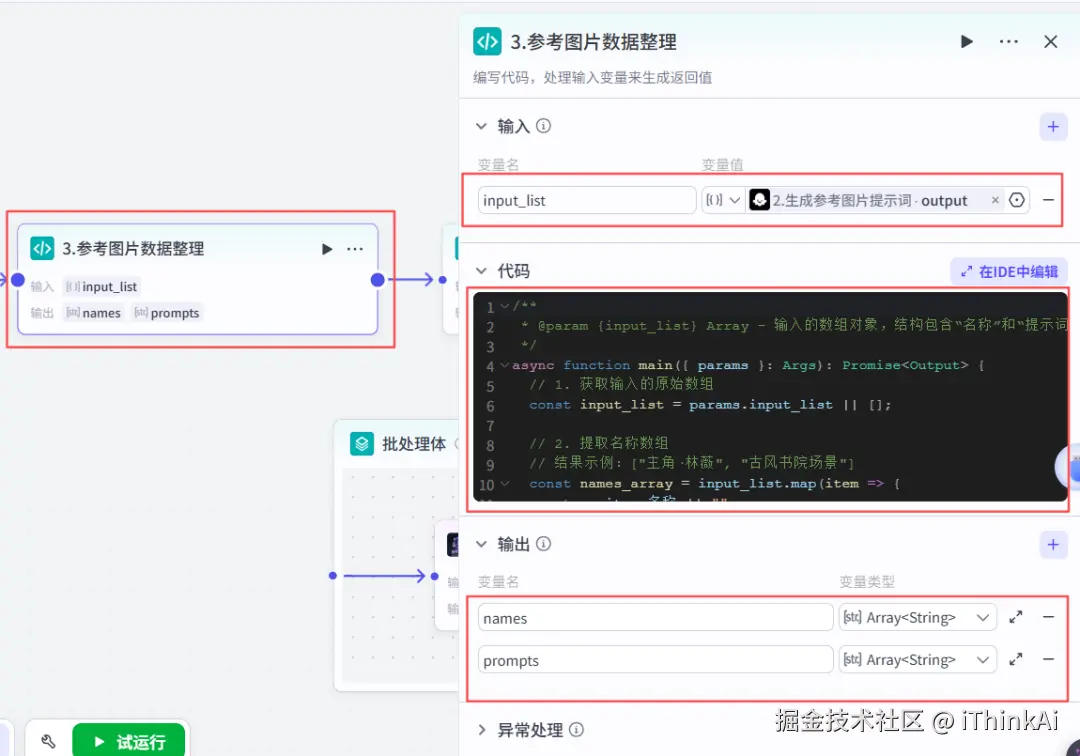 添加代码节点,对参考图片数据进行整理。