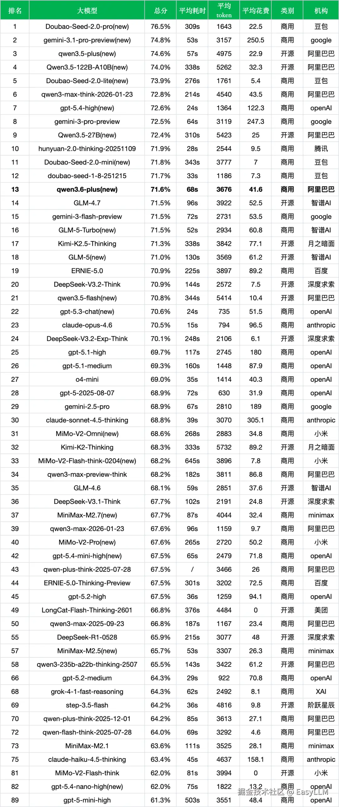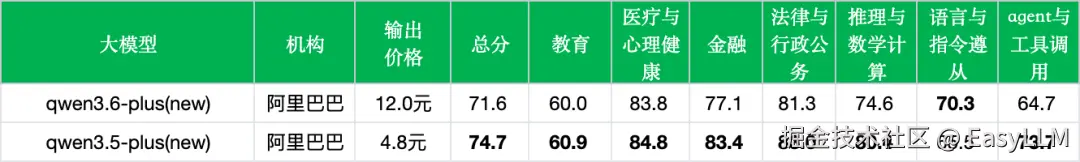 - 对比其他厂商新模型:qwen3.6-plus(71.6%)与GLM-4.7(71.5%)、gemini-3-flash-preview(71.5%)、GLM-5-Turbo(71.5%)处于同一水平线,与Doubao-Seed-2.0-mini(71.8%)也基本持平。但与榜首的Doubao-Seed-2.0-pro(76.5%)和gemini-3.1-pro-preview(74.8%)相比,存在约3至5个百分点的差距。