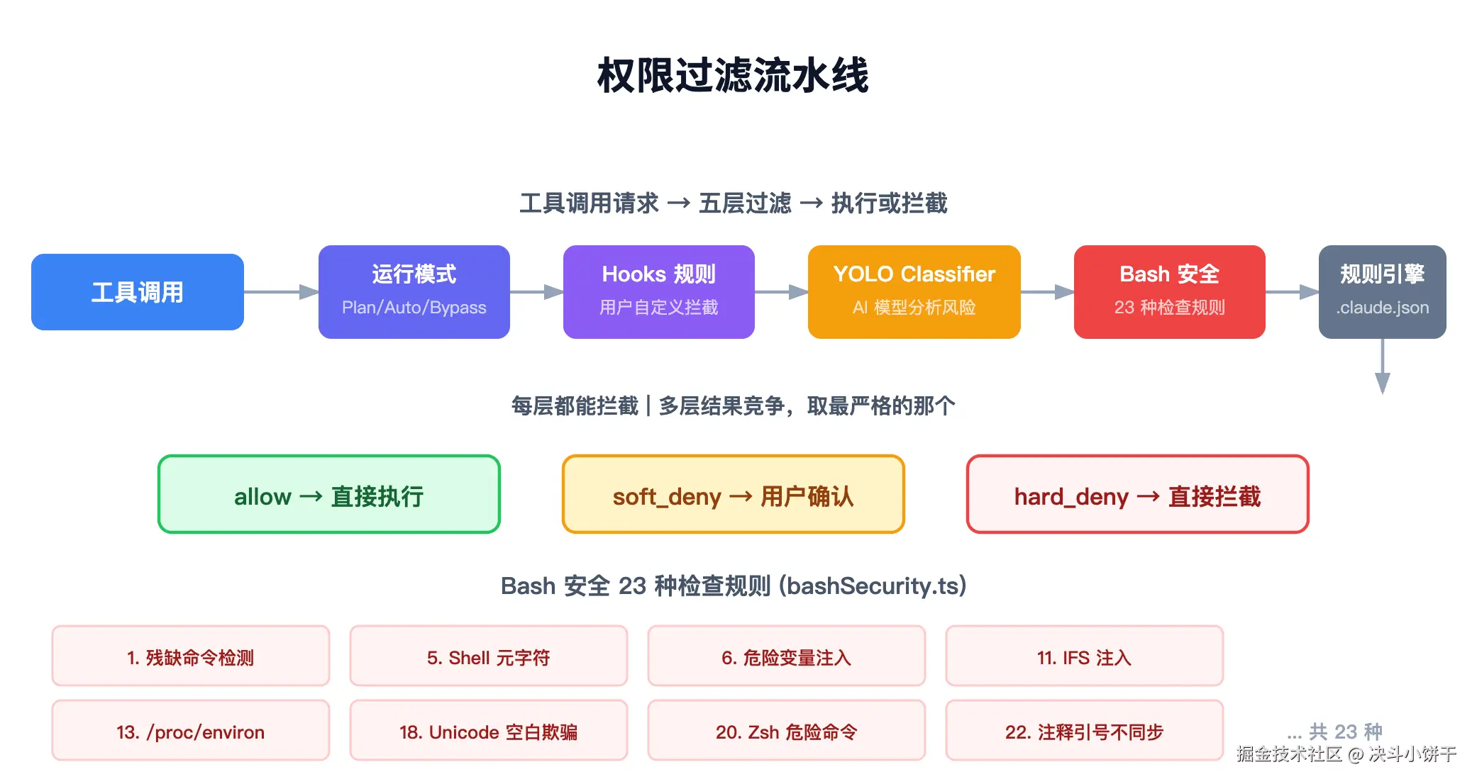 其中第 4 点 Bash 命令安全检查的严格程度远超我的预期。在 tools/BashTool/bashSecurity.ts 这个文件里,定义了 23 种 安全检查规则: