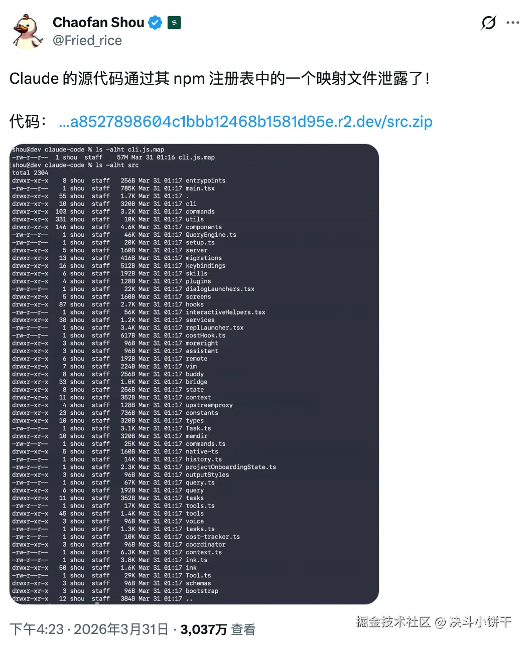称全球最强的 AI 编程工具 Claude Code 的 50 多万行源码泄露了!一家以 AI 安全著称的公司,自己却在代码发布环节翻了车。