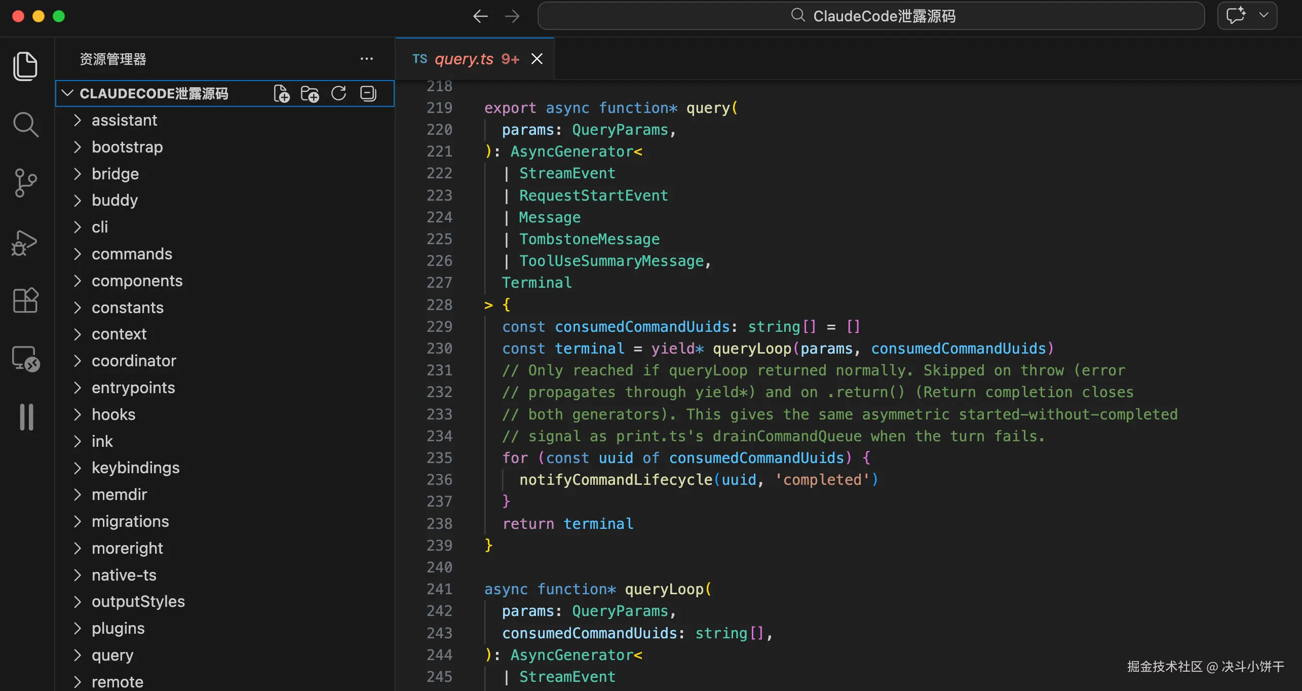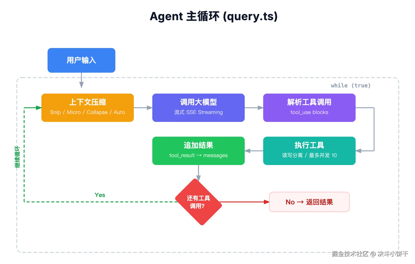 但我打开负责核心对话循环的 query.ts 文件一看,好家伙,最核心的代码其实就是一个 while(true) 无限循环!