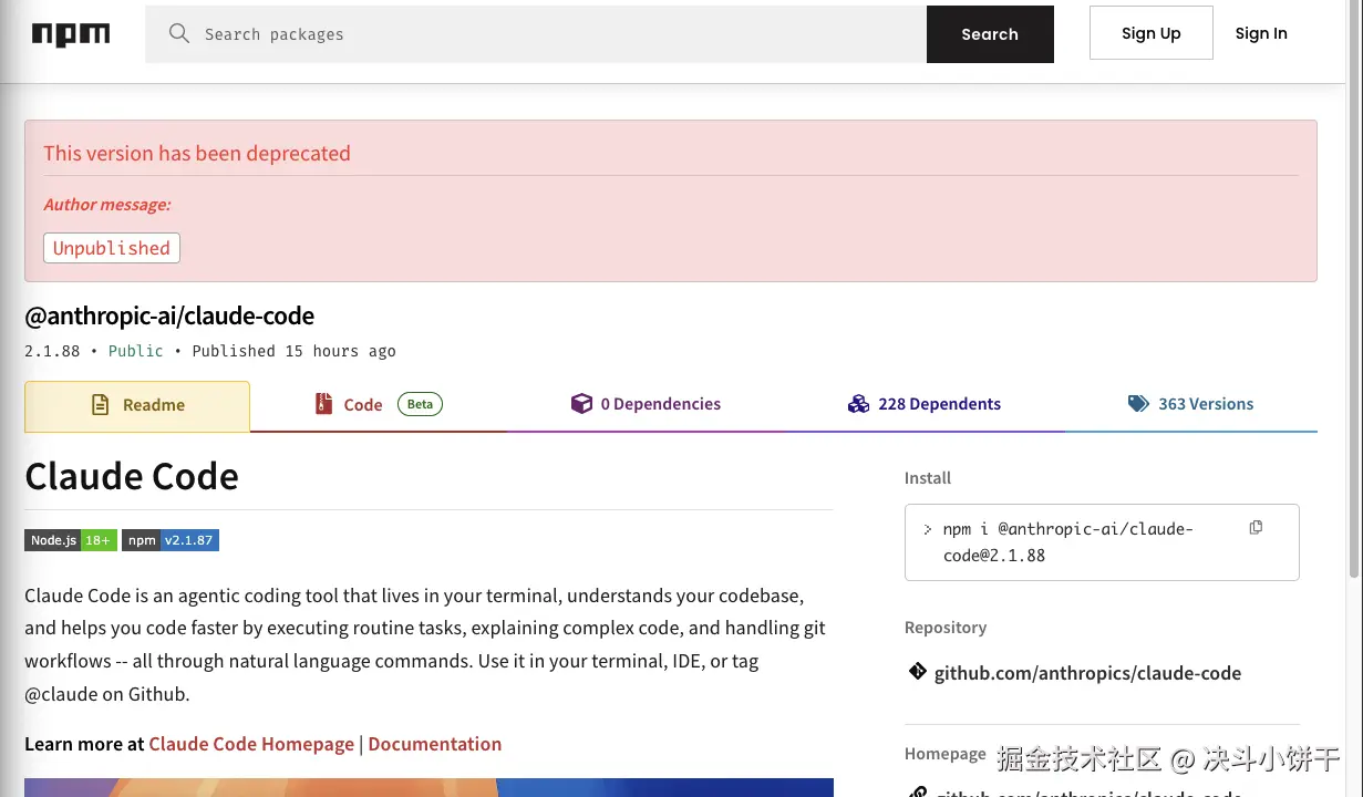 Claude Code 是通过 npm 发布的,你可以把 npm 理解为程序员的「应用商店」,开发者把写好的工具打包上传到这里,别人一行命令就能安装。