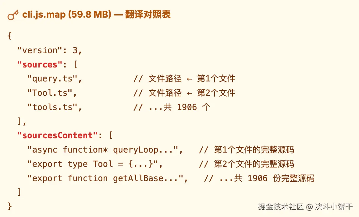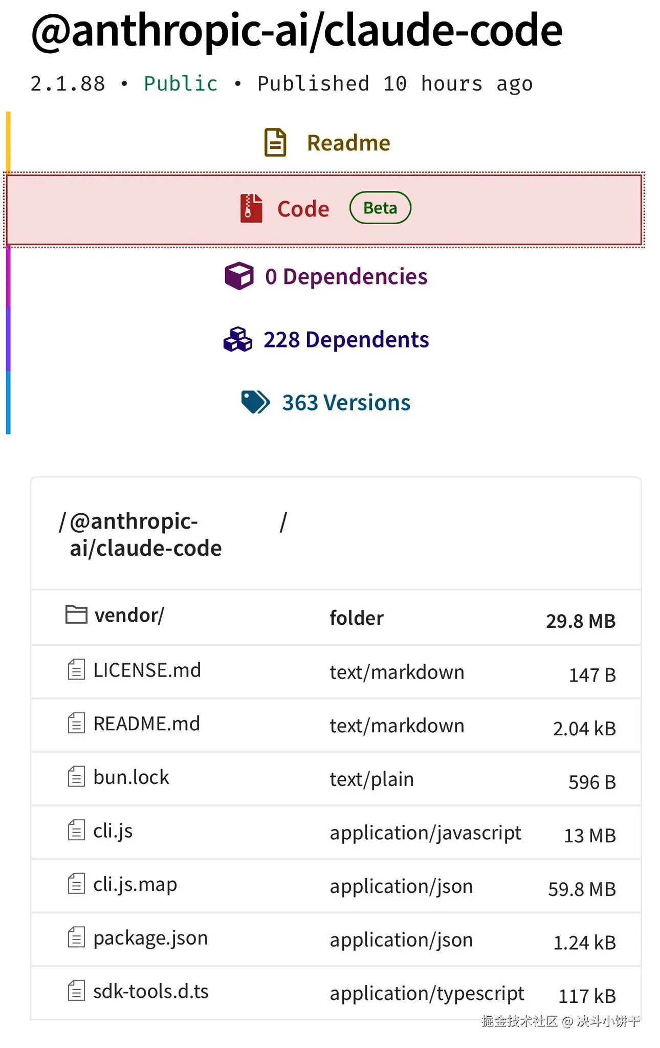 结果 Anthropic 的工程师在发布 Claude Code 2.1.88 版本的时候,打包工具 Bun 默认生成了 Source Map 文件,而他们忘了在发布配置里把 .map 文件排除掉。于是一个 59.8 MB 的 cli.js.map 文件就这么被直接发到了公开的 npm 仓库。