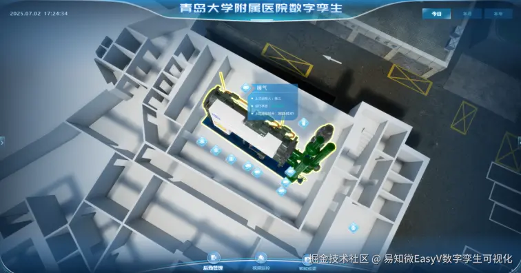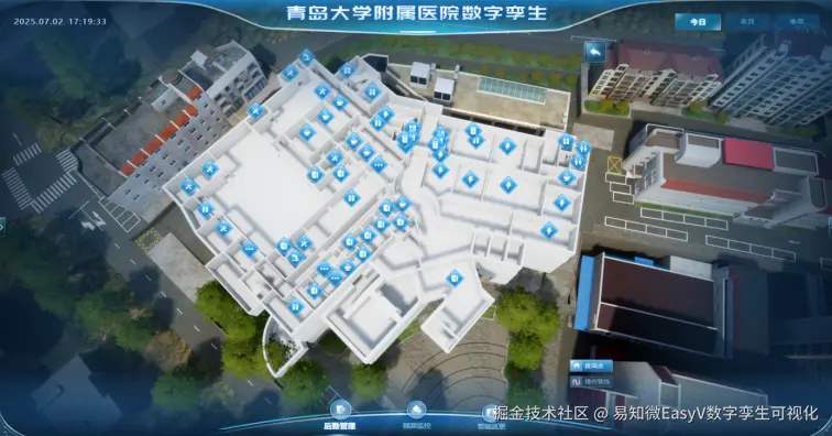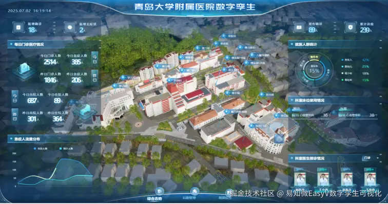 为全面提升大型三甲医院运营管理的协同水平,易知微通过数字孪生技术,将青岛大学附属医院的物理空间与运营数据动态映射至虚拟场景,构建了覆盖院区环境、建筑空间、地下管网及设备资产的一体化数字孪生医院。整合综合态势、后勤管理、视频安防、智能巡更、设备资产等核心业务模块数据,实现医院运行状态的实时感知与集中呈现。