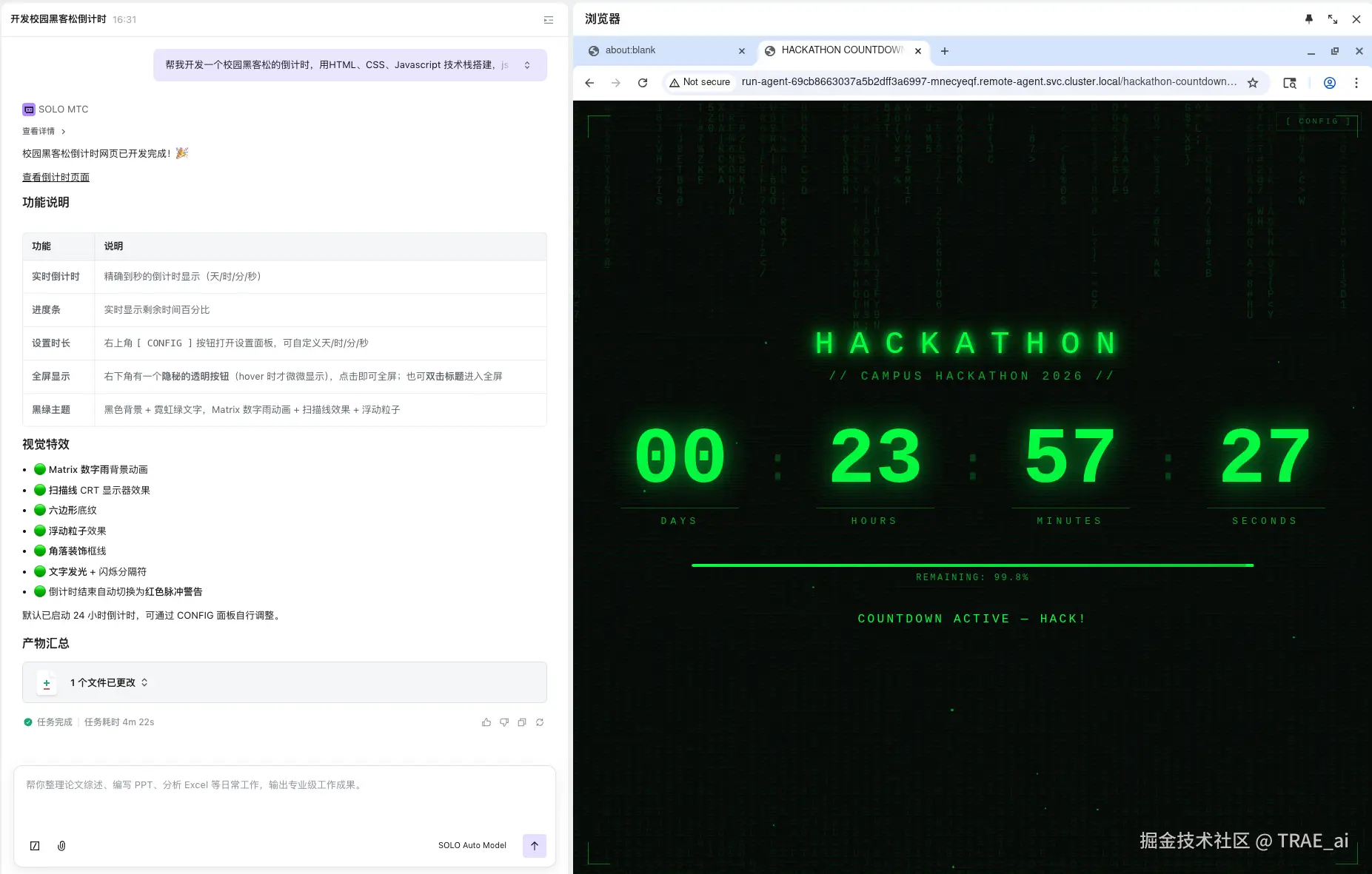 本次我们就用 TRAE 线下活动黑客松的场景举例,日常运营同学在线下举行黑客松活动,在 Coding 环节需要设置倒计时,本次就用 MTC 模式搭建一个倒计时网站。