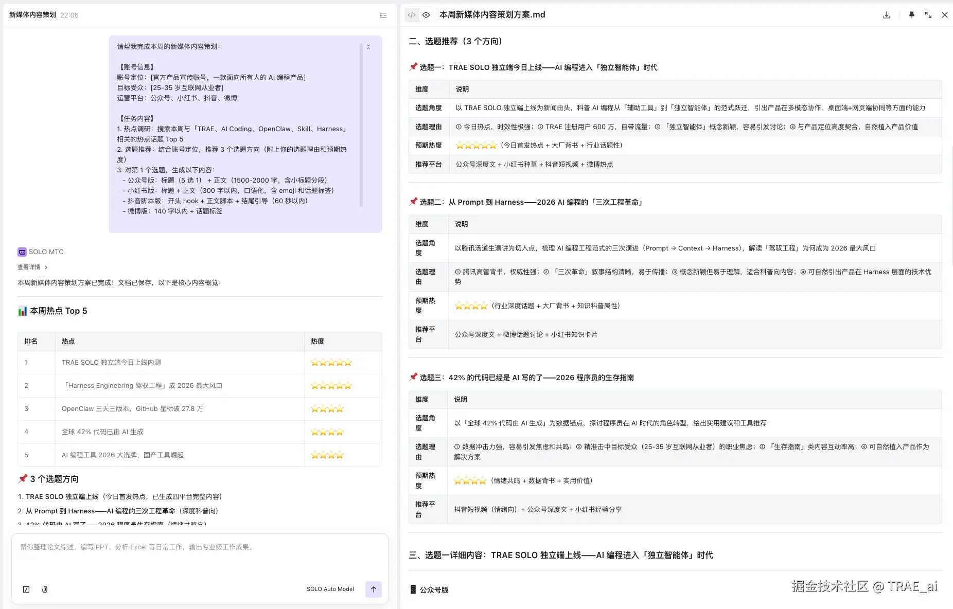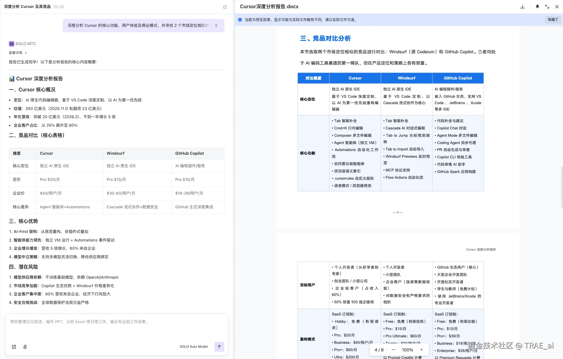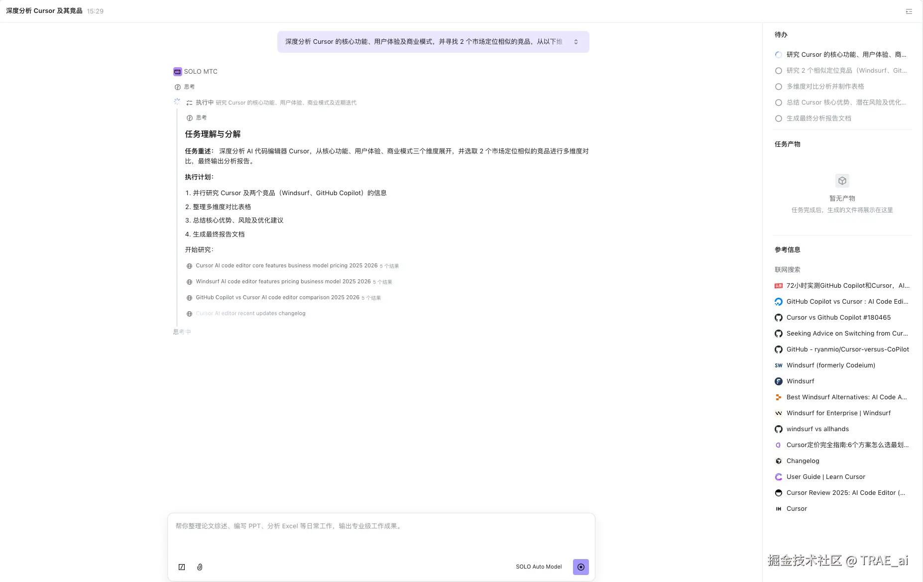从繁琐的数据整理,到烧脑的竞品分析;从像素级的原型绘制,到耗费心力的内容制作。全新 SOLO 正在将那些我们习以为常的“重复劳动”,转化为一个个可以被 AI 理解和执行的任务。
