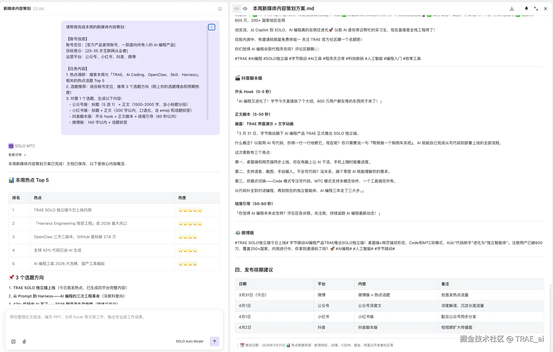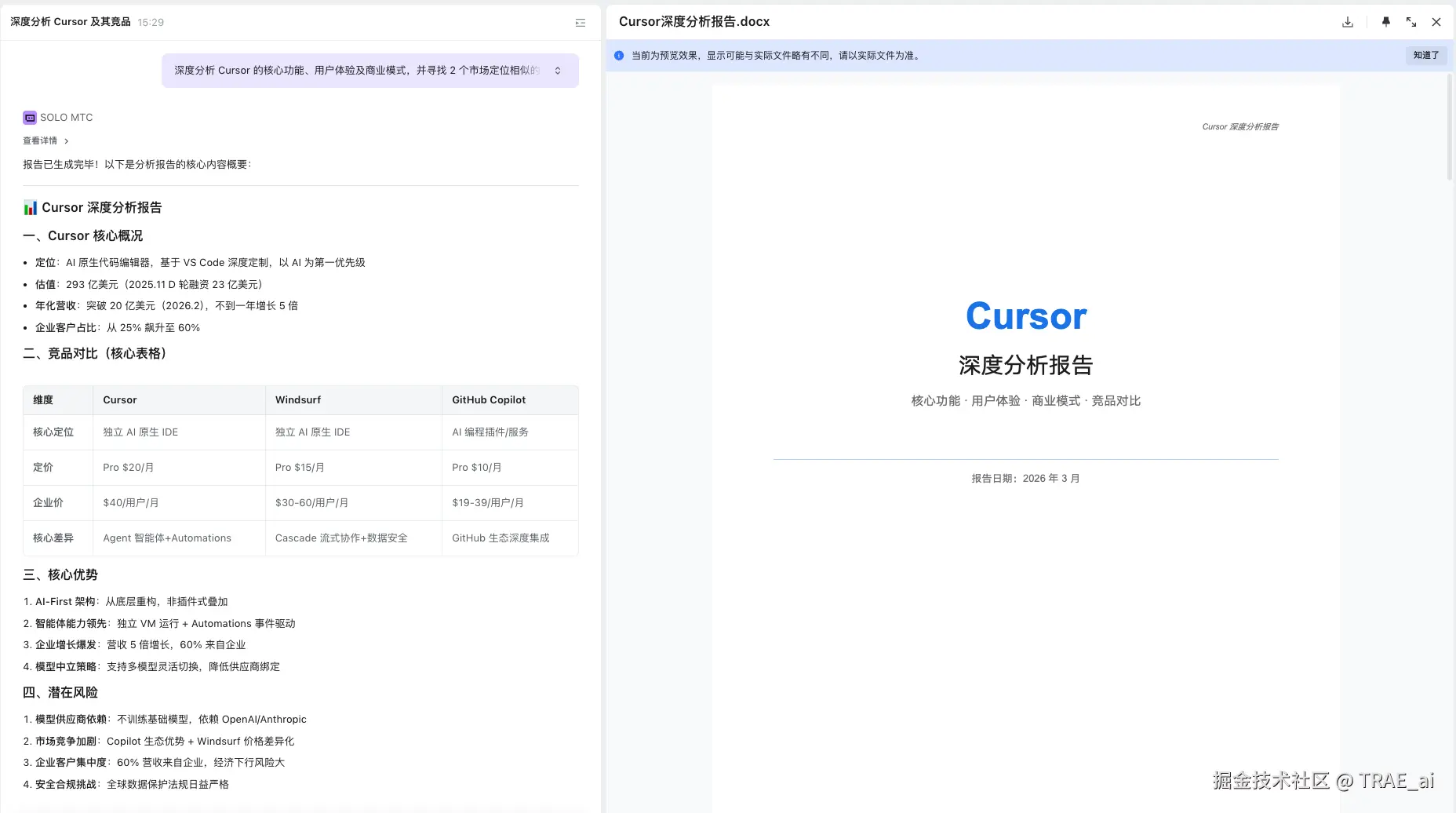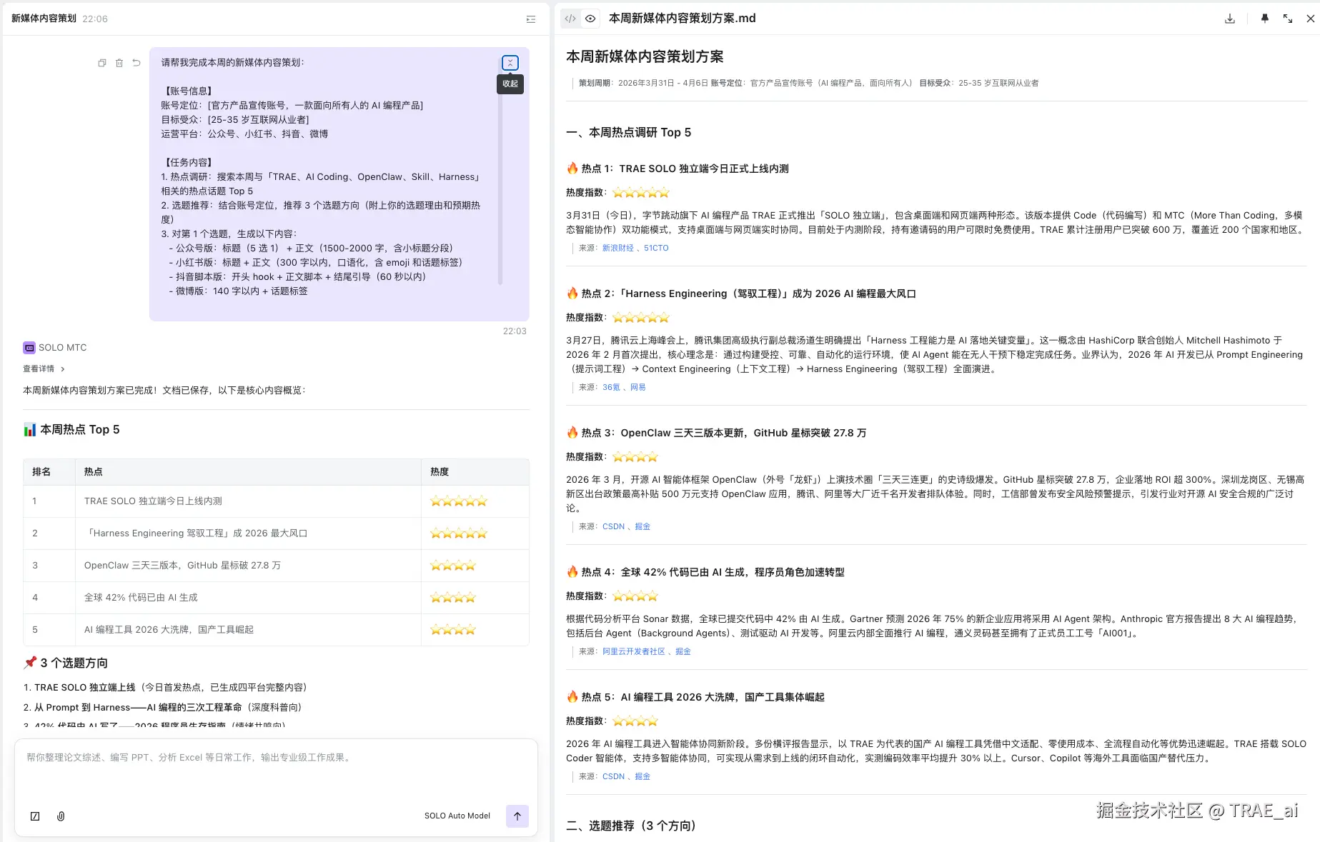 从繁琐的数据整理,到烧脑的竞品分析;从像素级的原型绘制,到耗费心力的内容制作。全新 SOLO 正在将那些我们习以为常的“重复劳动”,转化为一个个可以被 AI 理解和执行的任务。
