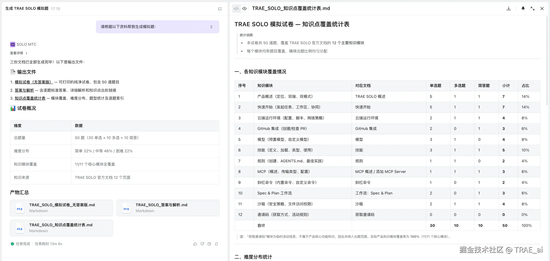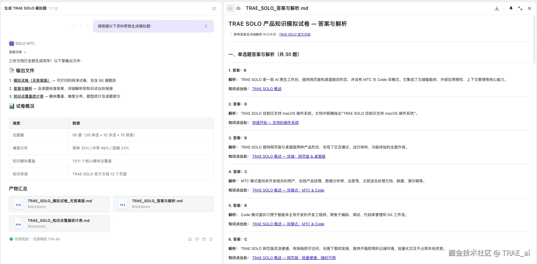 我们选择读取 TRAE SOLO 的整个文档页面,让 AI 帮我们出几道模拟题,看看我们有多了解 TRAE SOLO。