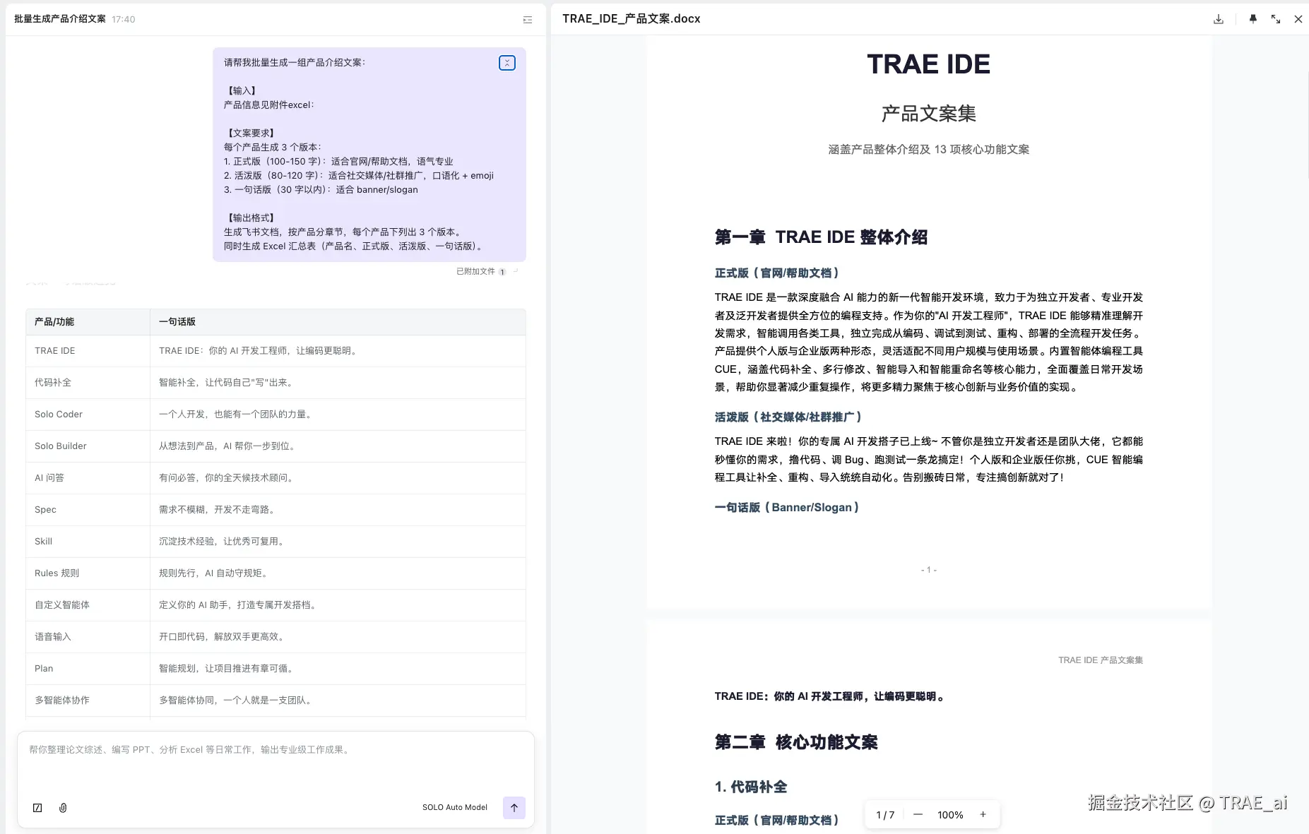 我们本次选择让 AI 帮我们生成 TRAE IDE 的产品介绍。
