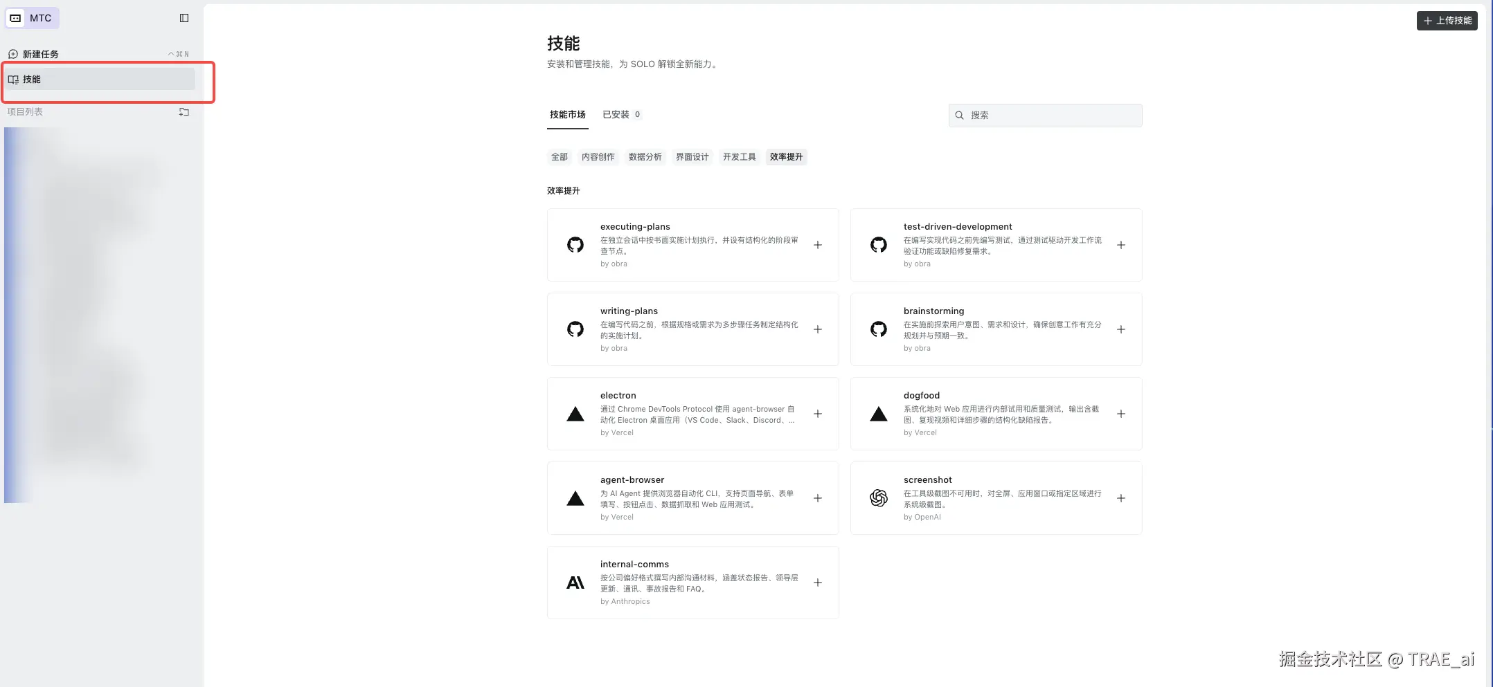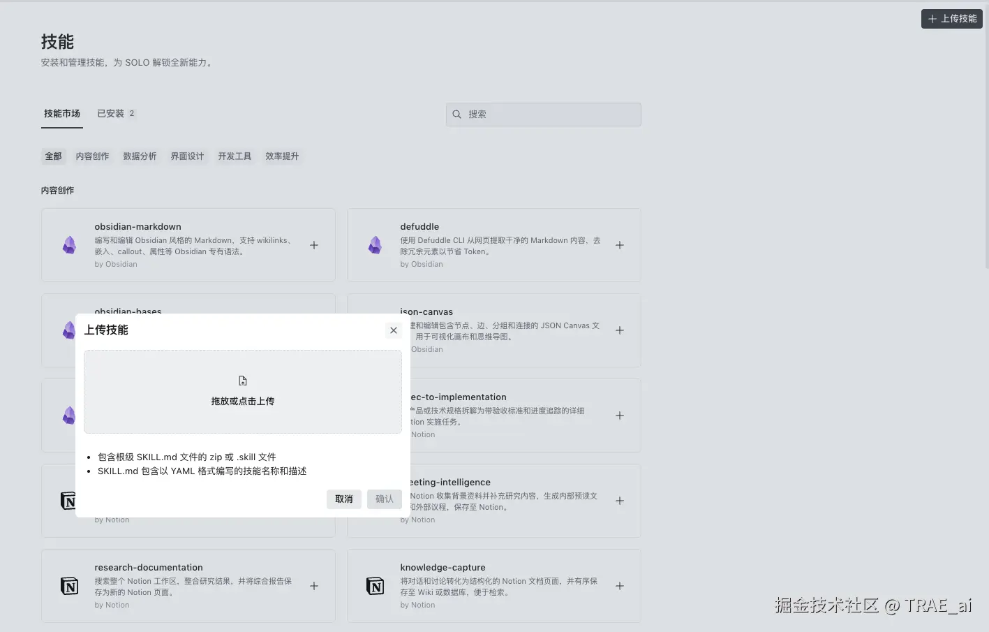 同时,我们也内置了 Skills 技能市场,里面已经提供了一些市面上的热门 Skills,支持一键添加,也可以点击右上角上传你自己喜欢的技能。