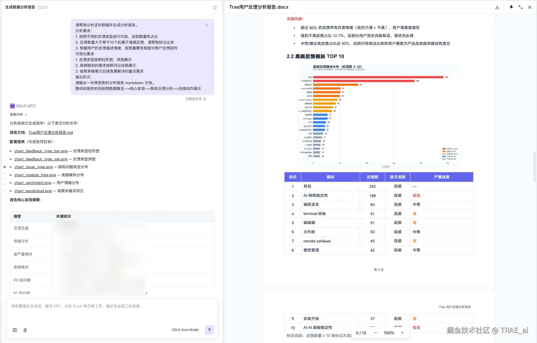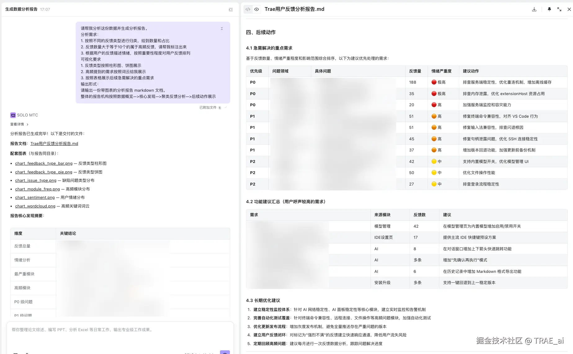 我们本次直接下载 TRAE 后台收到的用户反馈,让 AI 帮我们输出一份分析报告。
