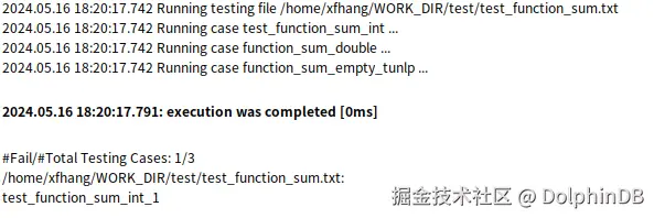 测试用例结束完成后,测试结果部分将会输出到 /home/xfhang/output/ 目录下的test_function_sum_output.txt 文件中,而正在执行的测试用例仍会打印到控制台中。