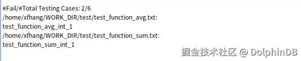 图 2-2 中 #Fail/#Total Testing Cases: 2/6 ,6表示的是 test 目录下的所有测试文件用例数总和, 2表示所有文件失败用例数总和,并将每个测试文件失败的用例打印出来。如果指定了 outputFile,则会将图中的结果输出到指定的文件中。