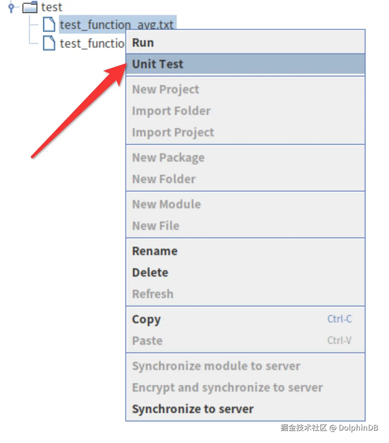DolphinDB GUI 客户端安装及使用教程见:GUI 客户端,导入测试目录后,右键点击需要执行单元测试的文件名,然后点击 Unit Test 选项,即可对该测试文件执行单元测试,例如图 2-3 中对 test 目录下的 test_function_avg.txt 文件执行单元测试,也可以右键点击 test 目录名,此时会对 test 目录下的所有脚本文件(不包括子目录下的脚本文件)执行单元测试,并将结果打印在 Log 栏。