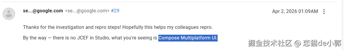 从目前 issue 看,这是 Gemini/Agent 输入框的文本输入实现,和 Windows IME / 候选词窗口 / 焦点切换之间的兼容问题,并且不是 JCEF(Java Chromium Embedded Framework)的问题 ,而是 Compose Multiplatform UI + 文本状态/IME 集成 这一层的问题: