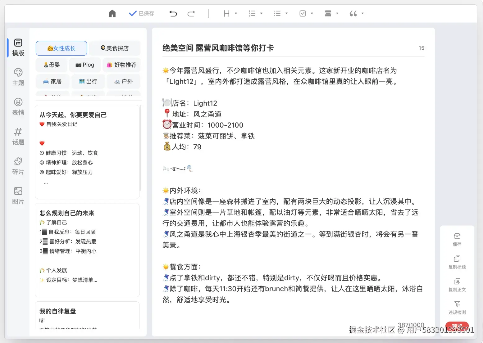・违禁词检测: 自带内容违禁词检测功能,发布前一键检测,避免因违规导致笔记限流,新手也能轻松避坑。