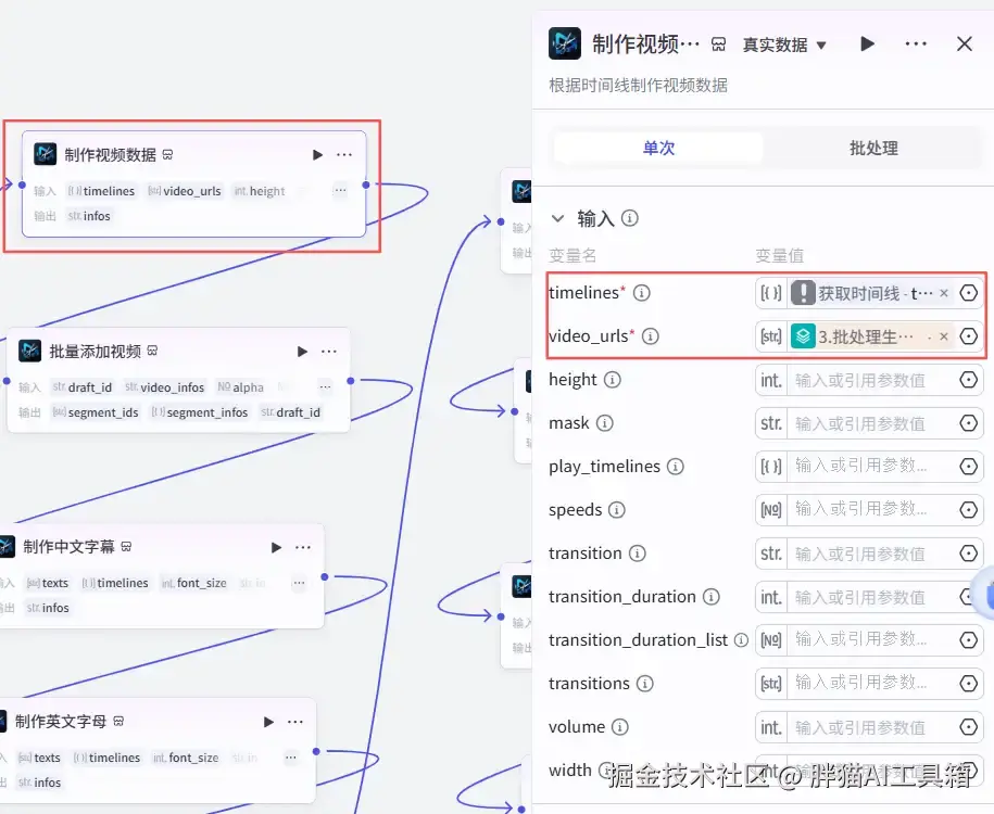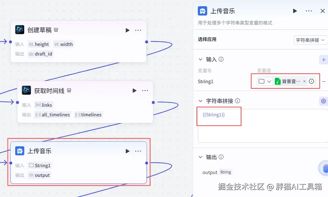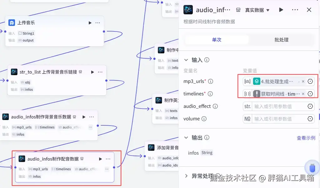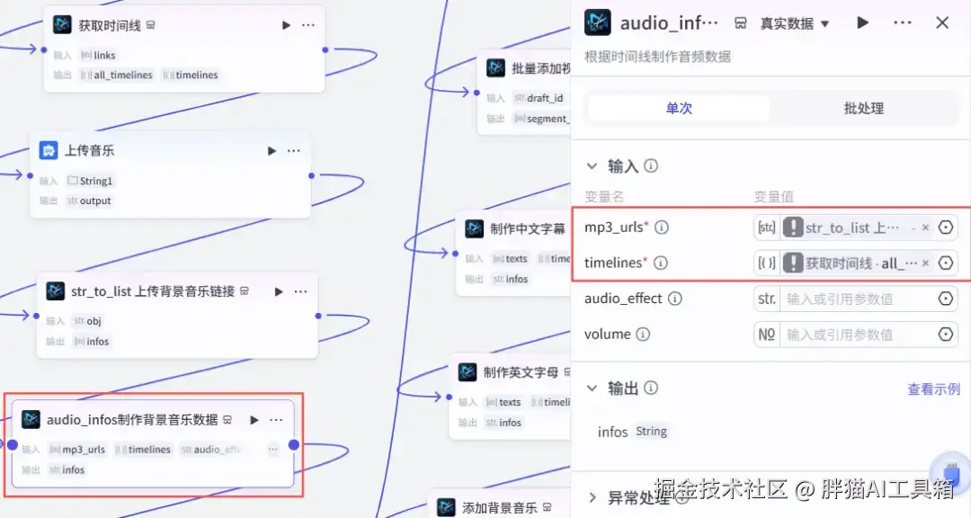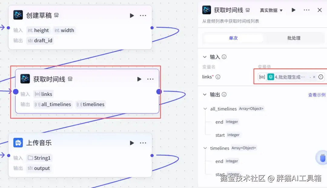 添加一个米核【剪映小助手】的【audio_timelines】节点,根据音频创建时间线。