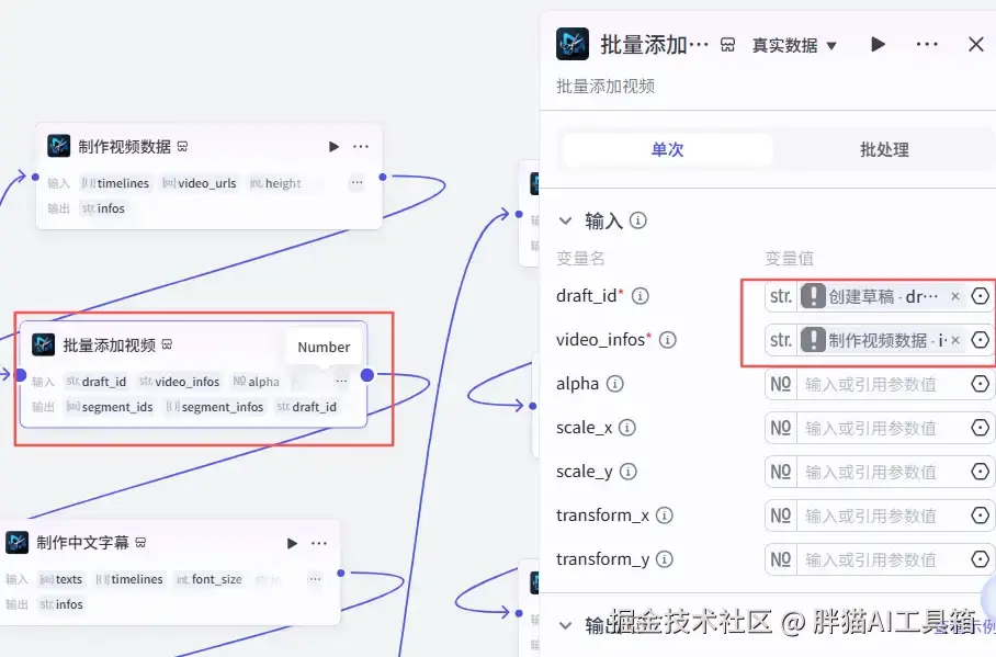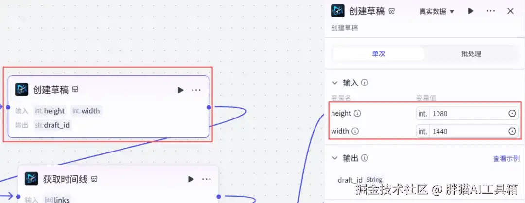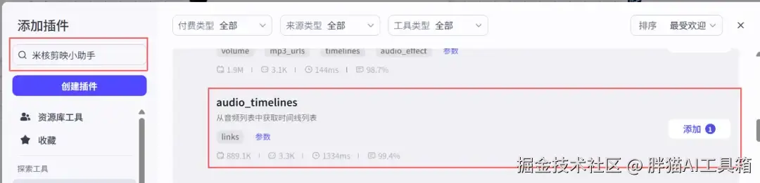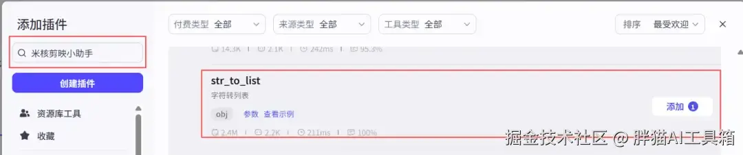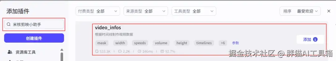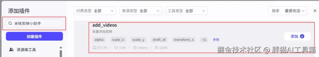 从添加插件中搜索米核剪映小助手找到【剪映小助手】并添加【create_draft】节点。