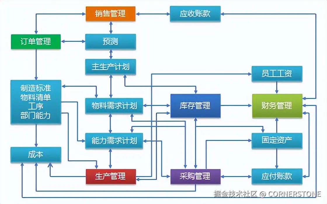 - 飞跃:ERP将管理的范围从制造端扩展到了整个企业。它整合了财务、人力资源、供应链管理(采购、销售、库存)、项目管理、售后服务等几乎所有企业职能。